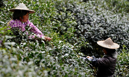 Farmers pick tea buds for making Jinjunmei tea in Tongmu Village of Wuyishan, southeast China's Fujian Province, April 9, 2020. In recent days, the Jinjunmei tea, a representative black tea produced in Tongmu Village of Wuyishan, has entered into its harvest and making season. (Xinhua/Wei Peiquan)
