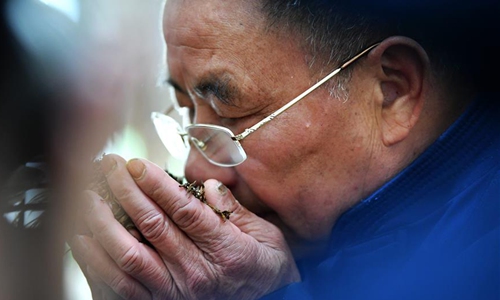 Tea maker Liang Tianmeng breaks tea buds apart after malaxation in Tongmu Village of Wuyishan, southeast China's Fujian Province, April 9, 2020. In recent days, the Jinjunmei tea, a representative black tea produced in Tongmu Village of Wuyishan, has entered into its harvest and making season. (Xinhua/Wei Peiquan)