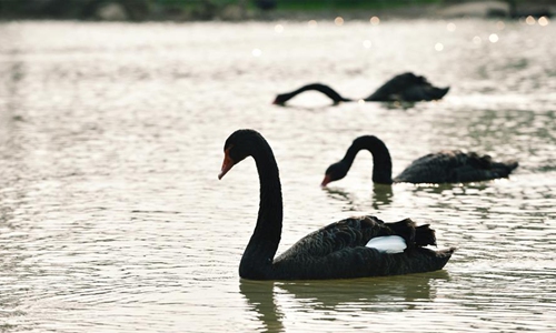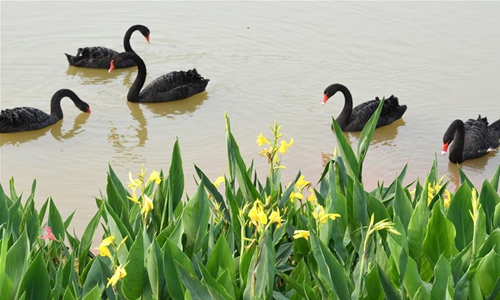 Black swans are seen at the Nanning Garden Expo Park in Nanning, south China's Guangxi Zhuang Autonomous Region, April 9, 2020. (Xinhua/Cui Bowen)