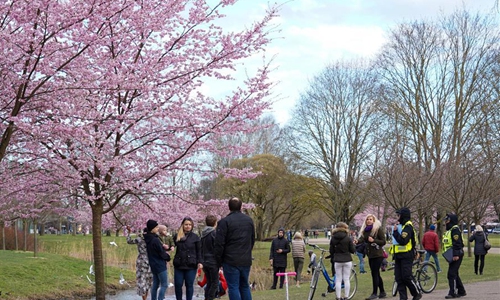 People admire cherry blossoms at Victory park in Riga, Latvia, on April 10, 2020. (Photo by Janis/Xinhua)