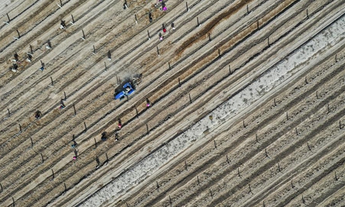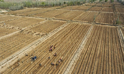 Aerial photo taken on April 10, 2020 shows staff members of the Xige Estate working in a grape plantation in northwest China's Ningxia Hui Autonomous Region. Workers of wine companies in the east Helan Mountain area are busy with farm work in grape plantation and making efforts to take orders to promote local wine industry. (Xinhua/Feng Kaihua)
