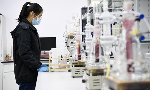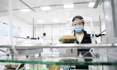 A staff member inspects the liquor sample at the Xige Estate in northwest China's Ningxia Hui Autonomous Region, April 10, 2020. Workers of wine companies in the east Helan Mountain area are busy with farm work in grape plantation and making efforts to take orders to promote local wine industry. (Xinhua/Wang Peng)