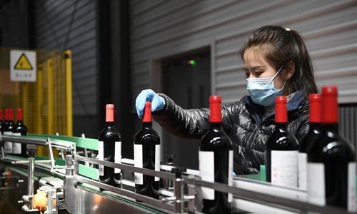 A staff member conducts sampling inspection to the finished wine products at the Xige Estate in northwest China's Ningxia Hui Autonomous Region, April 10, 2020. Workers of wine companies in the east Helan Mountain area are busy with farm work in grape plantation and making efforts to take orders to promote local wine industry. (Xinhua/Wang Peng)