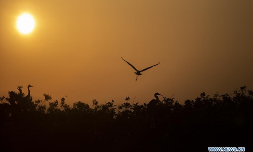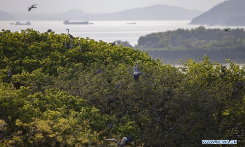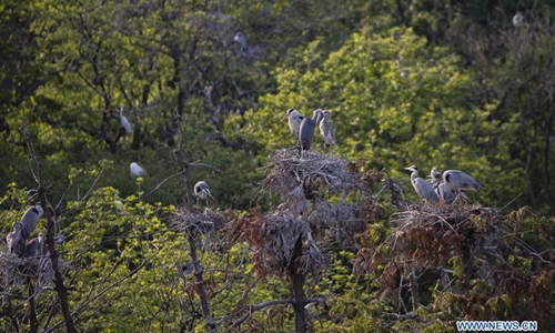 Photo taken on April 9, 2020 shows migrant birds at a heron protection base in Duchang County, east China's Jiangxi Province. In 2012, the county's forestry bureau set up a heron protection base to provide a better place to migrant birds to inhabit and breed. There are now nearly 7,000 migrant birds at the protection base. Photo:Xinhua