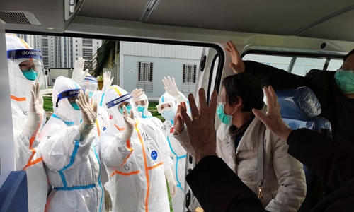 Cured patients waving goodbye to medical workers before leaving the Leishenshan hospital in Wuhan, central China's Hubei Province, April 4, 2020. On Sunday, 17 coronavirus-infected patients recovered and were discharged from the hospital. (Photo by Gao Xiang/Xinhua)