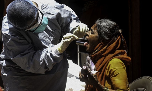 A medical worker wearing a protective suit takes a swab from a woman to test for novel coronavirus disease at a residential area in Mumbai, India, April 9, 2020. Photo:Xinhua