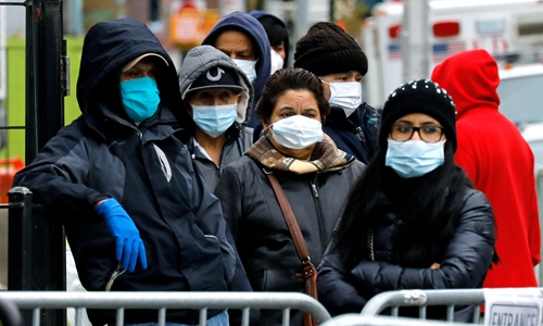 People wearing protective face masks queue outside Elmhurst Hospital in Queens, New York on April 2. Photo: IC