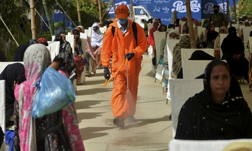 A worker sprays disinfectant as women wait to collect financial assistance under the government's emergency cash program for people in need during a nationwide lockdown aimed at containing COVID-19 in Karachi, Pakistan on Saturday. Photo: AFP