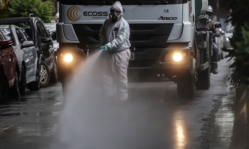 A staff member disinfects the ground at the Clinicas Hospital in Sao Paulo, Brazil, March 24, 2020. (Photo by Rahel Patrasso/Xinhua)