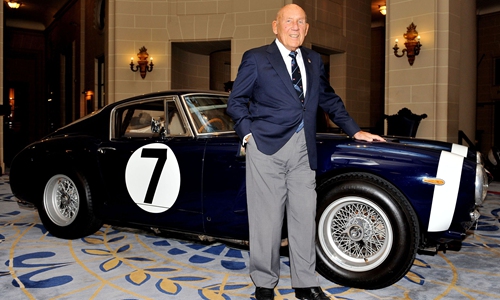 Sir Stirling Moss stands in front of the Ferrari 250 GT SWB, which he raced to victory in the Goodwood Tourist Trophy in 1961, during a photocall at the Royal Automobile Club in London, to launch his new book on April 30, 2015. Photo: VCG