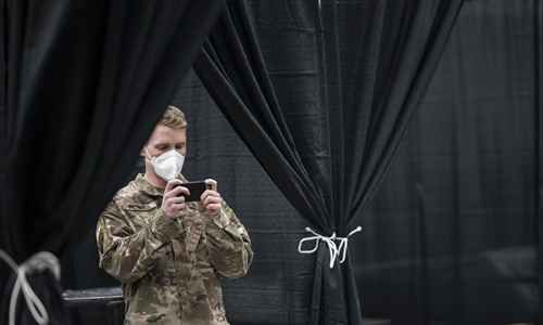 A soldier wearing a mask takes a photo at a temporary hospital located at the USTA Billie Jean King National Tennis Center during the outbreak of the novel coronavirus (which causes COVID-19), in the Queens borough on Sunday in New York City. Photo: AFP