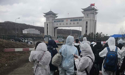 Working staff wearing protective suits wait at the entrance to Suifenhe port. (Photo: Courtesy Cao Jie)
