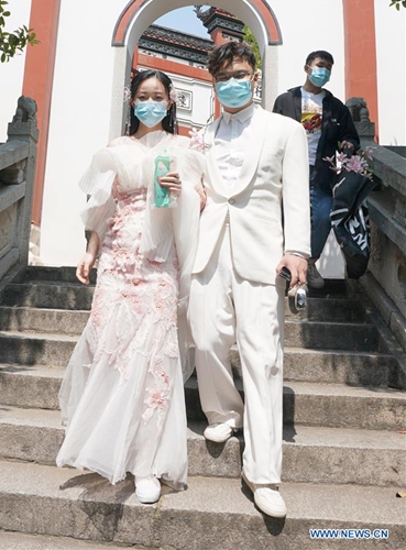 A pair of lovers pose for wedding photos at the Qingchuan pavilion in Wuhan, central China's Hubei Province, April 12, 2020. People in Wuhan have restarted wedding preparations as the coronavirus outbreak wanes. (Xinhua/Wang Yuguo)
