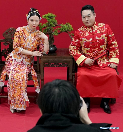 A pair of lovers pose for wedding photos at a photo studio in Wuhan, central China's Hubei Province, April 12, 2020. People in Wuhan have restarted wedding preparations as the coronavirus outbreak wanes. (Xinhua/Wang Yuguo)