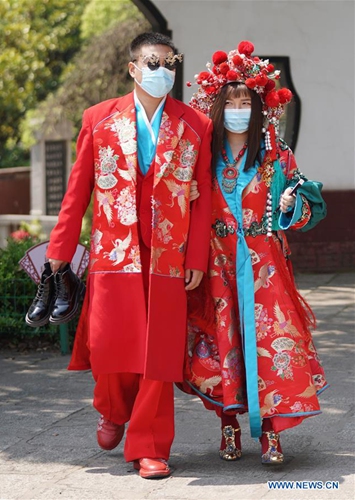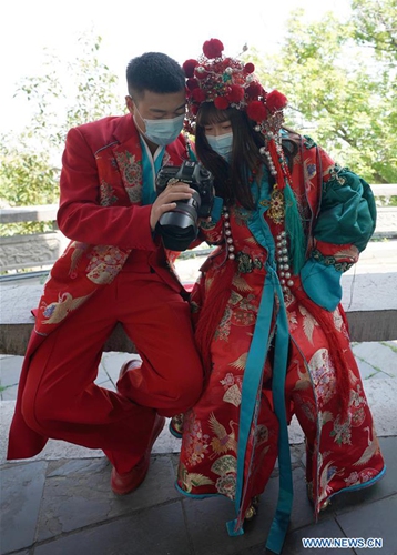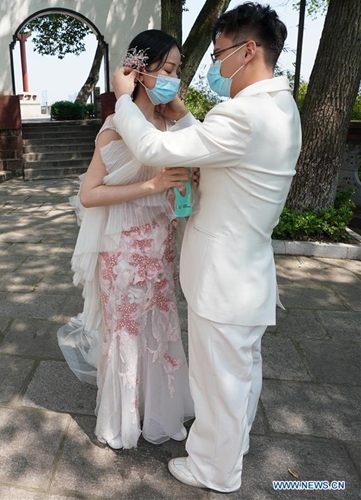 A pair of lovers prepare to take wedding photos at the Qingchuan pavilion in Wuhan, central China's Hubei Province, April 12, 2020. People in Wuhan have restarted wedding preparations as the coronavirus outbreak wanes. (Xinhua/Wang Yuguo)