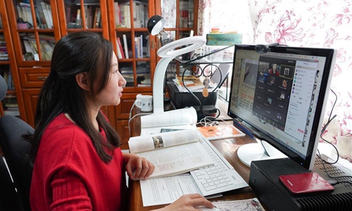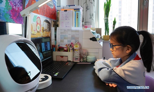 Ma Zihan, a third grader of a primary school in Chaoyang District, attends an online class meeting from home in Beijing, capital of China, April 13, 2020. Since primary and high schools in Beijing were ordered to postpone spring semesters over coronavirus concerns, local educational authority has urged to establish mechanisms for students of studying online from home to accommodate continuous efforts in epidemic prevention and control. (Xinhua/Ju Huanzong)