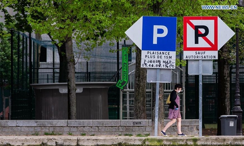 A woman wearing a face mask walks along the Bassin de la Villette in Paris, France, on April 12, 2020. As of Sunday, the number of people who have died from the COVID-19 in France totaled 14,393, representing a one-day increase of 561, down from Saturday's 643, while serious cases decreased for the fourth straight day. (Photo by Aurelien Morissard/Xinhua)