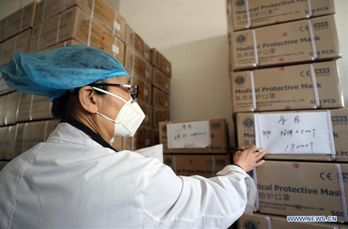 A staff member checks stockpile of medical masks at Liaoning Shengjingtang Biotechnology Co., Ltd in Shenyang, capital of northeast China's Liaoning Province, April 14, 2020. The company has been actively manufacturing medical masks that will be exported overseas. (Xinhua/Yang Qing)