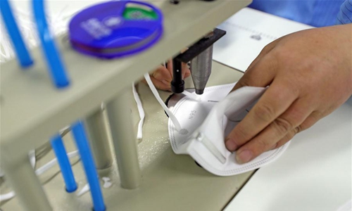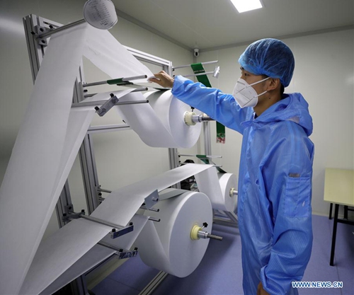 A worker produces medical masks at Liaoning Shengjingtang Biotechnology Co., Ltd in Shenyang, capital of northeast China's Liaoning Province, April 14, 2020. The company has been actively manufacturing medical masks that will be exported overseas. (Xinhua/Yang Qing)