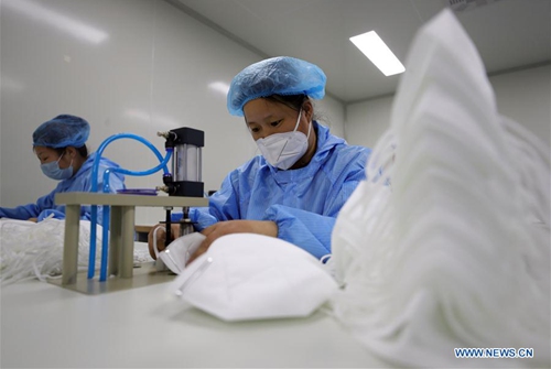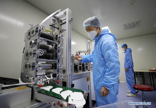 Workers produce medical masks at Liaoning Shengjingtang Biotechnology Co., Ltd in Shenyang, capital of northeast China's Liaoning Province, April 14, 2020. The company has been actively manufacturing medical masks that will be exported overseas. (Xinhua/Yang Qing)
