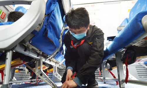 A technician at Shandong Airlines in Qingdao, East China's Shandong Province modifies a passenger plane to provide cargo-only services on Tuesday. More Chinese carriers are switching to cargo-only services against the background of insufficient freight capacity and high freight rates. Photo:cnsphoto