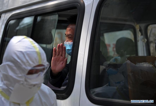 A cured patient waves goodbye to staff members at the Changjiangxincheng medical observation station in Wuhan, central China's Hubei Province, April 13, 2020. Photo: Xinhua