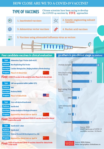 there are also two other vaccines in the world that are close to Phase II clinical trials as of Tuesday, which were separately developed by US drugmakers Moderna Inc. and Inovio Pharmaceuticals Inc.