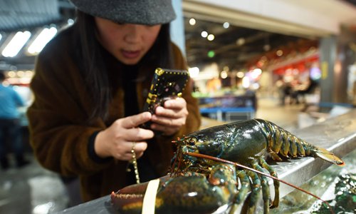 A consumer takes photo of lobsters at a supermarket in Hangzhou, capital of East China’s Zhejiang Province. Photo: VCG