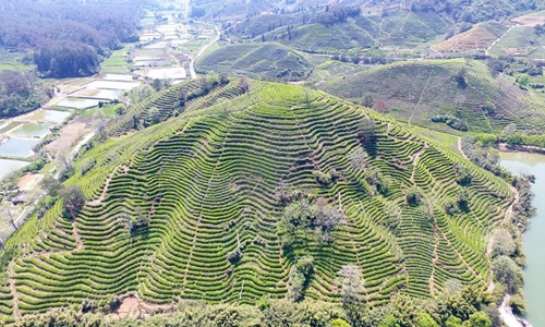 Aerial photo taken on April 15, 2020 shows a tea garden in Wuyi Mountain scenic area, southeast China's Fujian Province. A tea culture activity kicked off in Wuyi Mountain scenic area on Wednesday, with tea farmers coming to pick spring tea. (Xinhua/Lin Shanchuan)