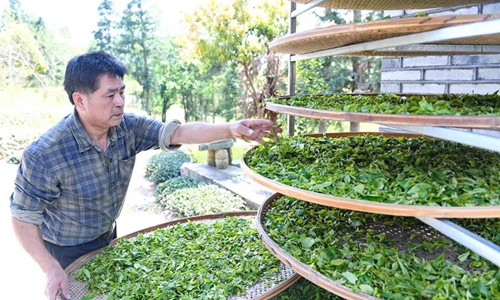 Tea maker Liu Feng airs tea leaves of Wuyi Rock Tea at a tea company in Wuyi Mountain scenic area, southeast China's Fujian Province, April 15, 2020. A tea culture activity kicked off in Wuyi Mountain scenic area on Wednesday, with tea farmers coming to pick spring tea. (Xinhua/Lin Shanchuan)