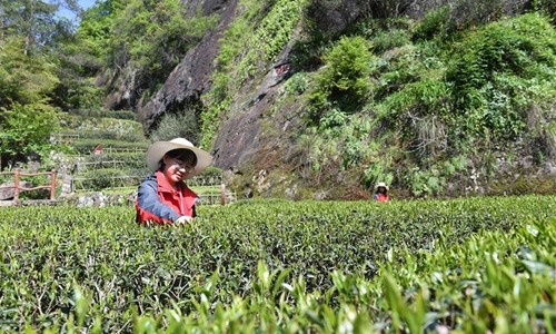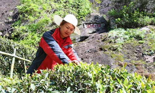 A woman picks spring tea at a tea garden in Wuyi Mountain scenic area, southeast China's Fujian Province, April 15, 2020. A tea culture activity kicked off in Wuyi Mountain scenic area on Wednesday, with tea farmers coming to pick spring tea. (Xinhua/Lin Shanchuan)