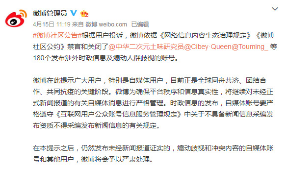 Weibo announced it will continue to strictly manage social media accounts, as these accounts don't have qualifications for collecting and publishing news as requested by China's online publishing regulations.