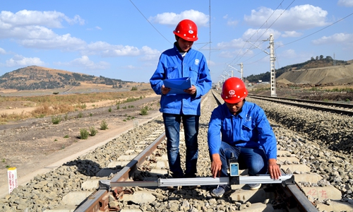Two Chinese employees work along the Addisababa Djibouti Railway in 2016 in Ethiopia. Photo: IC