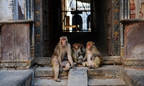 Monkeys sit outside a house during a government-imposed nationwide lockdown in Allahabad on Monday. Photo: AFP