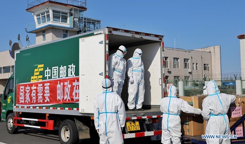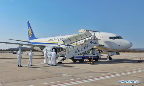 Staff transport medical supplies to a truck at the airport in Mudanjiang, northeast China's Heilongjiang Province, April 15, 2020. Hubei has sent medical supplies to the border province of Heilongjiang in northeast China amid the rising pressure of imported COVID-19 cases. (Xinhua)