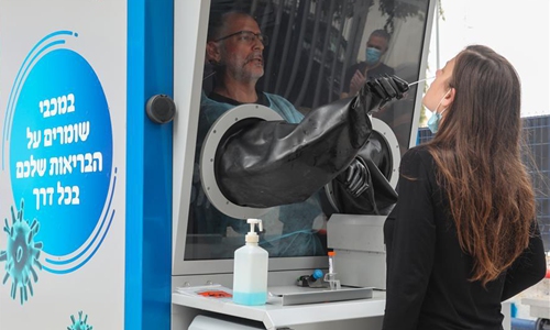 A medical staff works in a novel coronavirus testing booth in the central Israeli city of Tel Aviv on April 16, 2020. (Photo by Gil Cohen Magen/Xinhua)