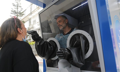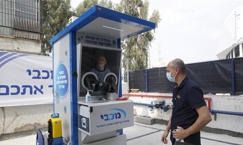A novel coronavirus testing booth is seen in the central Israeli city of Tel Aviv on April 16, 2020. (Photo by Gil Cohen Magen/Xinhua)