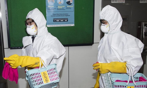 Staff members disinfect Gwanghwamun subway station in Seoul, South Korea, Feb. 28, 2020. South Korea confirmed 571 more cases of the COVID-19 on Friday, raising the total number of infections to 2,337. (Photo by Lee Sang-ho/Xinhua)