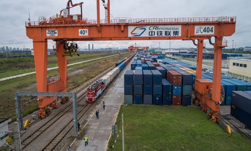 Aerial photo taken on March 28, 2020 shows a China-Europe freight train bound for Duisburg of Germany pulling out of the Wuhan terminal of China Railway Intermodal in Wuhan, central China's Hubei Province. Photo:Xinhua