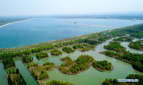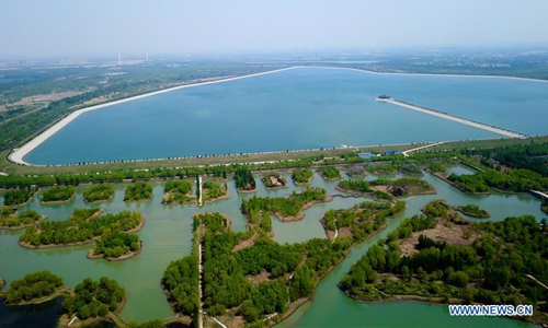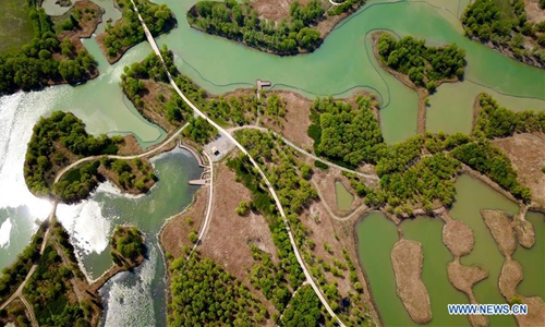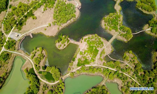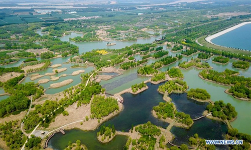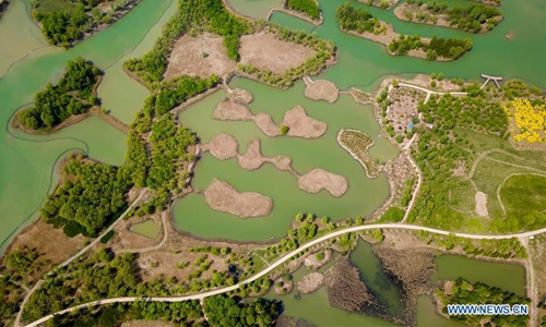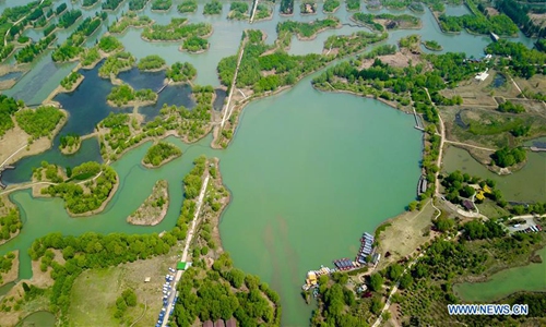 Aerial photo taken on April 17, 2020 shows a view of Jixi national wetland park in the west of Jinan, capital of east China's Shandong Province. (Xinhua/Guo Xulei)