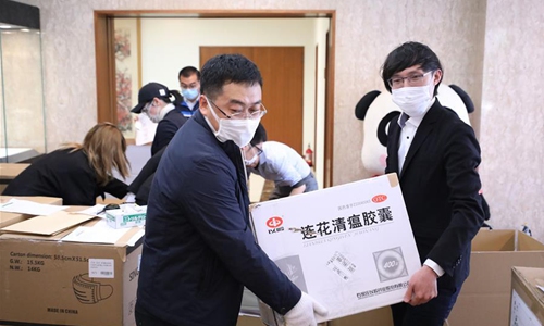 Staff members of the Chinese Embassy in Japan and representatives of Chinese students arrange health kits in Tokyo, Japan, April 17, 2020. The Chinese Embassy in Japan on Friday held a ceremony to distribute health kits containing face masks and other supplies to Chinese students studying in Japan. (Xinhua/Du Xiaoyi)