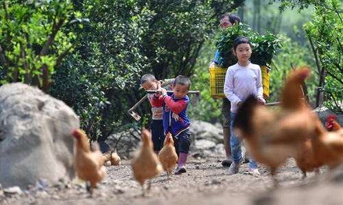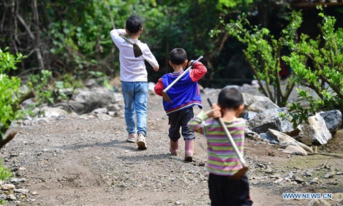 Pan Wenming's daughter and sons are on the way to plant trees in Tunqiu Village of Pingshan Township in Luzhai County, south China's Guangxi Zhuang Autonomous Region, April 7, 2020. Pan Wenming, 44, father of a 7-year-old daughter and 5-year-old twin sons, took the whole family out of poverty through hard work in a small mountain village in Guangxi. After working over ten years outside of hometown, Pan and his wife returned in 2012, because of the need to take care of his elderly parents, and started a business. They put in their hard work in agriculture and animal husbandry including raising goats and chickens and planting citrus on several hills. In recent years, the local rural economy has developed rapidly and their family income has steadily increased. Affected by the novel coronavirus epidemic, Pan had encountered difficulty in sales of his products. But as the epidemic waned and with the help of the local government, the products were sold smoothly in the end. The family planned to build new houses next year to improve living conditions. (Xinhua/Huang Xiaobang)