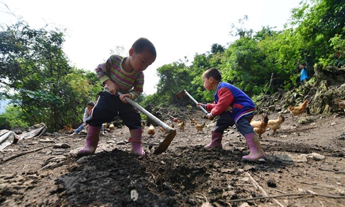 Pan Yuhao (L) and Pan Yuhua, Pan Wenming's twin sons, plant fruit trees in Tunqiu Village of Pingshan Township in Luzhai County, south China's Guangxi Zhuang Autonomous Region, April 7, 2020. Pan Wenming, 44, father of a 7-year-old daughter and 5-year-old twin sons, took the whole family out of poverty through hard work in a small mountain village in Guangxi. After working over ten years outside of hometown, Pan and his wife returned in 2012, because of the need to take care of his elderly parents, and started a business. They put in their hard work in agriculture and animal husbandry including raising goats and chickens and planting citrus on several hills. In recent years, the local rural economy has developed rapidly and their family income has steadily increased. Affected by the novel coronavirus epidemic, Pan had encountered difficulty in sales of his products. But as the epidemic waned and with the help of the local government, the products were sold smoothly in the end. The family planned to build new houses next year to improve living conditions. (Xinhua/Huang Xiaobang)