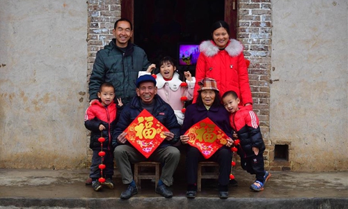 Pan Wenming's family pose for photos at home ahead of the Spring Festival in Tunqiu Village of Pingshan Township in Luzhai County, south China's Guangxi Zhuang Autonomous Region, Jan. 21, 2020. Pan Wenming, 44, father of a 7-year-old daughter and 5-year-old twin sons, took the whole family out of poverty through hard work in a small mountain village in Guangxi. After working over ten years outside of hometown, Pan and his wife returned in 2012, because of the need to take care of his elderly parents, and started a business. They put in their hard work in agriculture and animal husbandry including raising goats and chickens and planting citrus on several hills. In recent years, the local rural economy has developed rapidly and their family income has steadily increased. Affected by the novel coronavirus epidemic, Pan had encountered difficulty in sales of his products. But as the epidemic waned and with the help of the local government, the products were sold smoothly in the end. The family planned to build new houses next year to improve living conditions. (Xinhua/Huang Xiaobang)