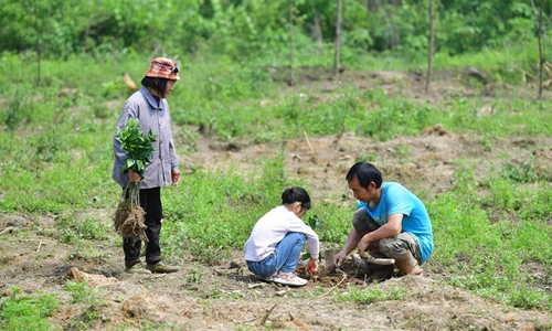 Pan Wenming (1st R) with his daughter Pan Yuxin (2nd R) and mother Qin Meifeng plant fruit trees in Tunqiu Village of Pingshan Township in Luzhai County, south China's Guangxi Zhuang Autonomous Region, April 7, 2020. Pan Wenming, 44, father of a 7-year-old daughter and 5-year-old twin sons, took the whole family out of poverty through hard work in a small mountain village in Guangxi. After working over ten years outside of hometown, Pan and his wife returned in 2012, because of the need to take care of his elderly parents, and started a business. They put in their hard work in agriculture and animal husbandry including raising goats and chickens and planting citrus on several hills. In recent years, the local rural economy has developed rapidly and their family income has steadily increased. Affected by the novel coronavirus epidemic, Pan had encountered difficulty in sales of his products. But as the epidemic waned and with the help of the local government, the products were sold smoothly in the end. The family planned to build new houses next year to improve living conditions. (Xinhua/Huang Xiaobang)