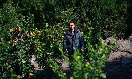 Pan Wenming walks in his orchard in Tunqiu Village of Pingshan Township in Luzhai County, south China's Guangxi Zhuang Autonomous Region, Jan 12, 2020. Pan Wenming, 44, father of a 7-year-old daughter and 5-year-old twin sons, took the whole family out of poverty through hard work in a small mountain village in Guangxi. After working over ten years outside of hometown, Pan and his wife returned in 2012, because of the need to take care of his elderly parents, and started a business. They put in their hard work in agriculture and animal husbandry including raising goats and chickens and planting citrus on several hills. In recent years, the local rural economy has developed rapidly and their family income has steadily increased. Affected by the novel coronavirus epidemic, Pan had encountered difficulty in sales of his products. But as the epidemic waned and with the help of the local government, the products were sold smoothly in the end. The family planned to build new houses next year to improve living conditions. (Xinhua/Huang Xiaobang)