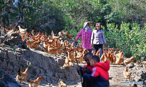 Xu Yumei (L) and Qin Meifeng, Pan Wenming's wife and his mother, prepare to feed the chickens in Tunqiu Village of Pingshan Township in Luzhai County, south China's Guangxi Zhuang Autonomous Region, Jan 12, 2020. Pan Wenming, 44, father of a 7-year-old daughter and 5-year-old twin sons, took the whole family out of poverty through hard work in a small mountain village in Guangxi. After working over ten years outside of hometown, Pan and his wife returned in 2012, because of the need to take care of his elderly parents, and started a business. They put in their hard work in agriculture and animal husbandry including raising goats and chickens and planting citrus on several hills. In recent years, the local rural economy has developed rapidly and their family income has steadily increased. Affected by the novel coronavirus epidemic, Pan had encountered difficulty in sales of his products. But as the epidemic waned and with the help of the local government, the products were sold smoothly in the end. The family planned to build new houses next year to improve living conditions. (Xinhua/Huang Xiaobang)