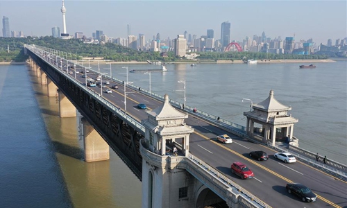 Aerial photo shows the Yangtze River bridge during the morning rush hour in Wuhan, central China's Hubei Province, April 15, 2020. (Xinhua/Li He)