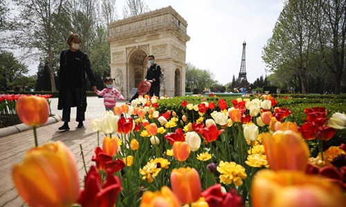 A field of blooming tulips is seen at the Beijing World Park in Beijing, April 16, 2020. (Photo: China News Service/Zhao Juan)