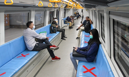 Commuters sit on marked areas to ensure social distancing inside a light rapid transit train in Palembang, Indonesia amid concerns of the COVID-19 outbreak. Photo: AFP
